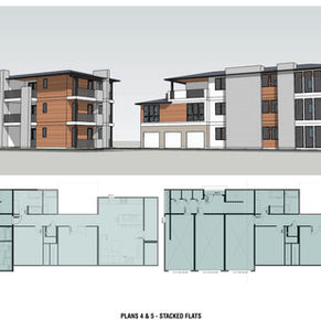 Reimagines a cluster neighborhood into T-shaped modules to improve density, land efficiency, parking layout, and walkability. A mix of plan formats allows a broad swath of home buyers to find something up their alley — ranging from single-bedroom ADUs to a 2,200 SF single-family dwelling, with three-story duets and stacked flats in between. With twenty-one homes per cluster, we exceeded a 25 DU/AC. A greenway lines the perimeter of each T-Cell, allowing pedestrian access through the site all while avoiding vehicular traffic. A focus on paseo-access, large decks, and front yards encourages natural neighborhood connections.